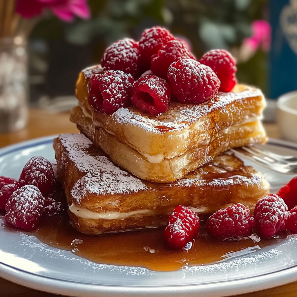 Savor the delightful combination of creamy mascarpone and fresh raspberries in this golden French toast, perfect for your Friendsgiving celebration!