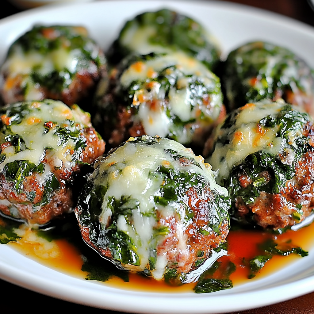 Savor the delightful combination of juicy meatballs packed with fresh spinach and garlic, all topped with gooey mozzarella cheese. Perfect for any dinner gathering!